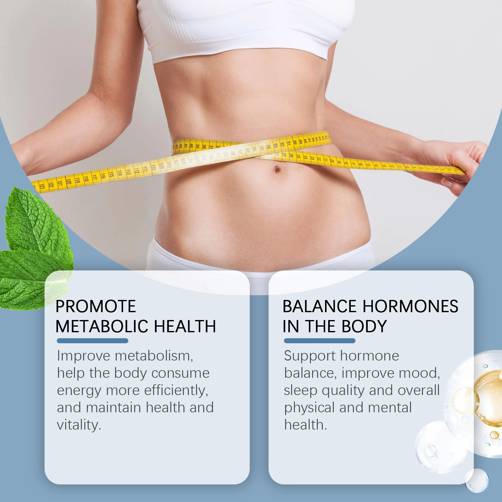Our care drops contain potassium sorbate and mint leaf extract. It can metabolism and help the burn energy more efficiently, maintaining th and vitality. The way to use it is very simple: shake it well before eating, 1-2 drops each time, 1-2 times a day. It can also support hormonal balance, mood, sleep quality, and overall physical and mental th.