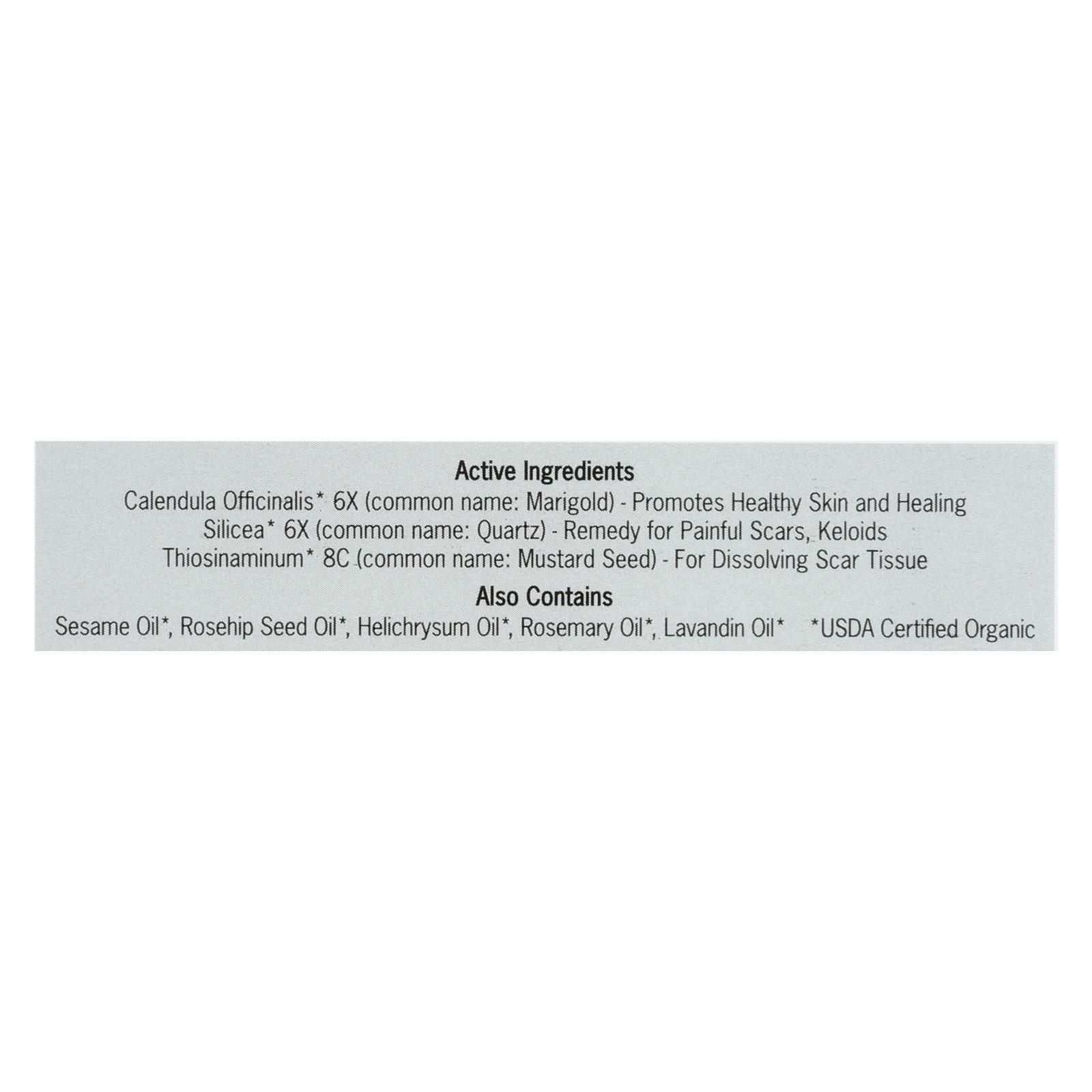 ingredients : active calendula officinalis* 6x;common name: marigold;- promotes healthy skin and healing silicea* 6x;common name: quartz;- remedy for painful scars;keloids thiosinaminum* 8c;common name: mustard seed;- for dissolving scar tissue;also contains sesame oil;rosehip seed oil;helichrysum oil;rosemary oil;lavandin oil
