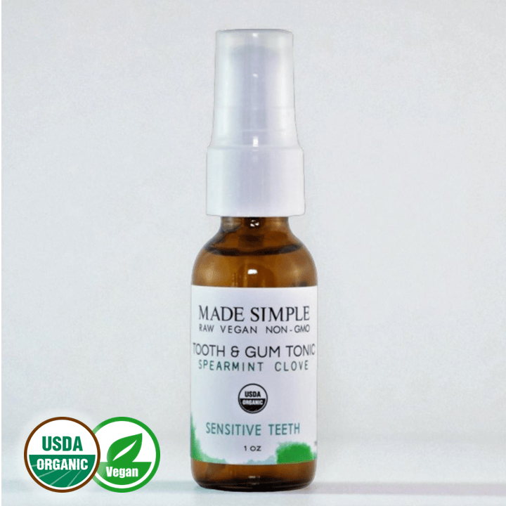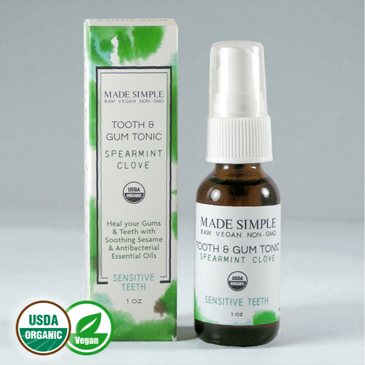 Our 100% natural, USDA certified organic, vegan, non-gmo, cruelty-free Spearmint Clove Tooth & Gum Tonic, based on the ancient ayurvedic practice of oil pulling, is carefully formulated to provide your gums with the nutrients they need to stay strong and healthy, while helping to naturally prevent gum decay.