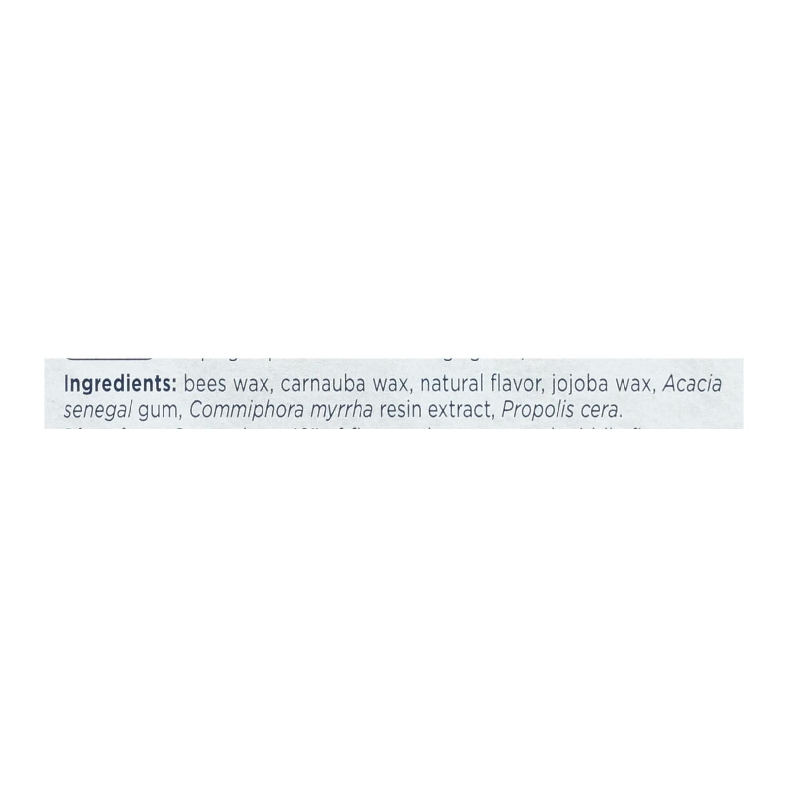 ingredients : bees wax;carnauba wax;natural flavor;jojoba wax;acacia senegal gum;commiphora myrrha resin extract;propolis cera